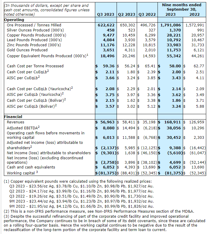 Consolidated results include results from the company's Yauricocha mine in Peru and the Bolivar mine in Mexico. The Cusi mine in Mexico was classified as a non-core asset in Q1 2023 and, on Sept. 20, 2023, was put on care and maintenance, with a sale process now under way. Current and historical production and financial results for Cusi are not included in the company's consolidated results and 2023 guidance and has been classified as a discontinued operation.