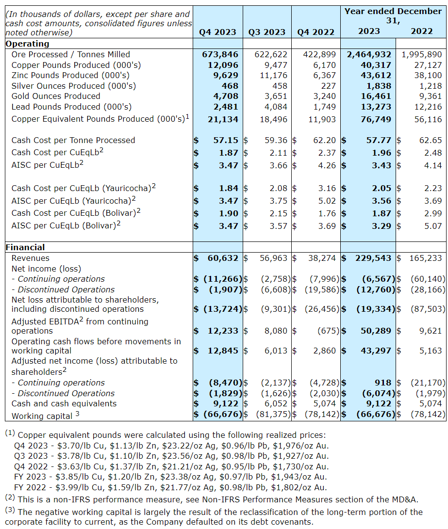Revenue from metals payable of $229.5-million in 2023, a significant increase of 39 per cent from 2022 annual revenue of $165.2-million. Revenues increased as a direct result of the production improvement at the Yauricocha and Bolivar mines.