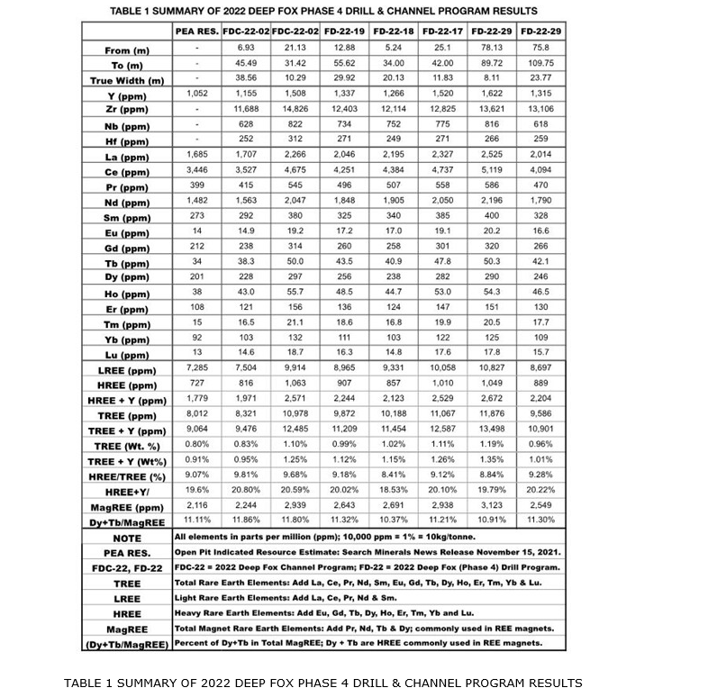 Search Minerals Inc. has received assay results for phase 4 (2022) drill holes and channels from its Deep Fox critical rare earth element (CREE) property in southeastern Labrador. Assays from all 63 exploration drill holes, 13 geotechnical drill holes and three channels show significant CREE values throughout the mineralized zone; mineralization is observed in all levels (surface channels, 25 metres (m), 50 m, 100 m, 150 m and 200 m). These results were not released earlier due to a lack of execution and oversight by the former board of directors. That chapter is closed. Under new leadership, Search is committed to accountability, transparency and driving this project forward without delay.