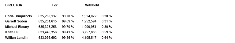 Shareholders elected five board members to serve on the company's board of directors until the next annual meeting of shareholders, or until their successors are elected or appointed, as detailed in the attached table.
