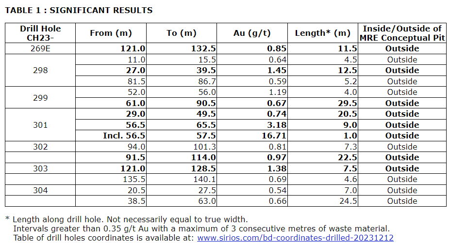 Dominique Doucet, president and chief executive officer of Sirios, stated: "We are very pleased with the results obtained during this drilling program. The fact that all the drilling targeting gold zone has intersected significant gold mineralization represents a remarkable exploration success. In addition, the expansion of this continuous zone in the metasediments shows the potential for resource growth of the Cheechoo deposit beyond the tonalite intrusion. More particularly, this new gold corridor makes it possible to generate very interesting exploration targets towards the northwest, over several hundred metres, or even kilometres."