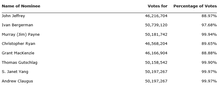 At the meeting, the number of directors to be elected to the board was fixed at eight, with 99.99 per cent of votes in favour. All eight director nominees were elected, with the results of the election as shown in the attached table.
