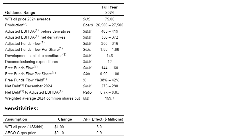 Disciplined capital allocation: Fully financed development capital budget of approximately $146-million, representing approximately 47 per cent of midpoint expected 2024 adjusted funds flow, which will be directed toward the company's deep portfolio of light-oil-weighted development opportunities in Saskatchewan and Alberta;