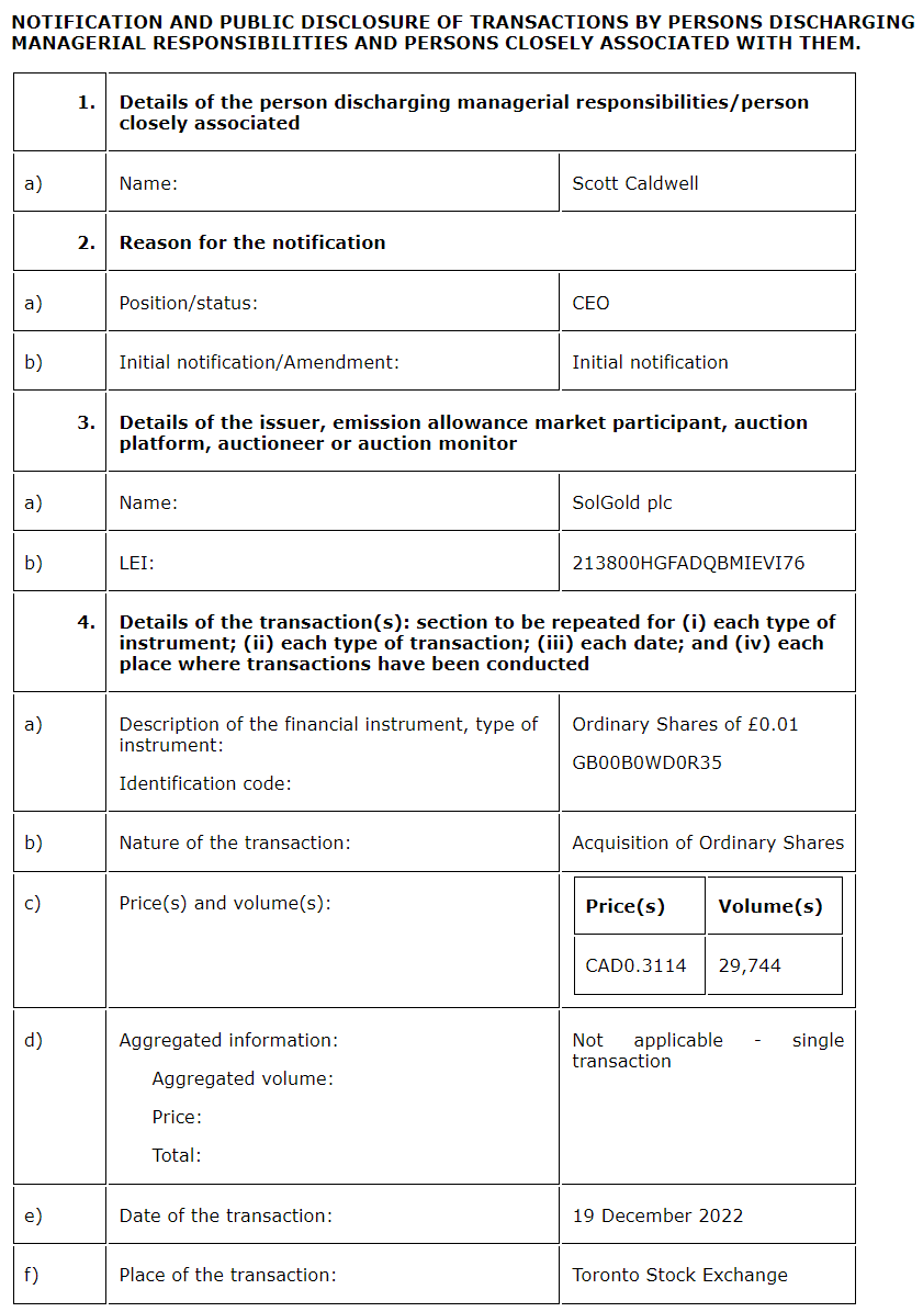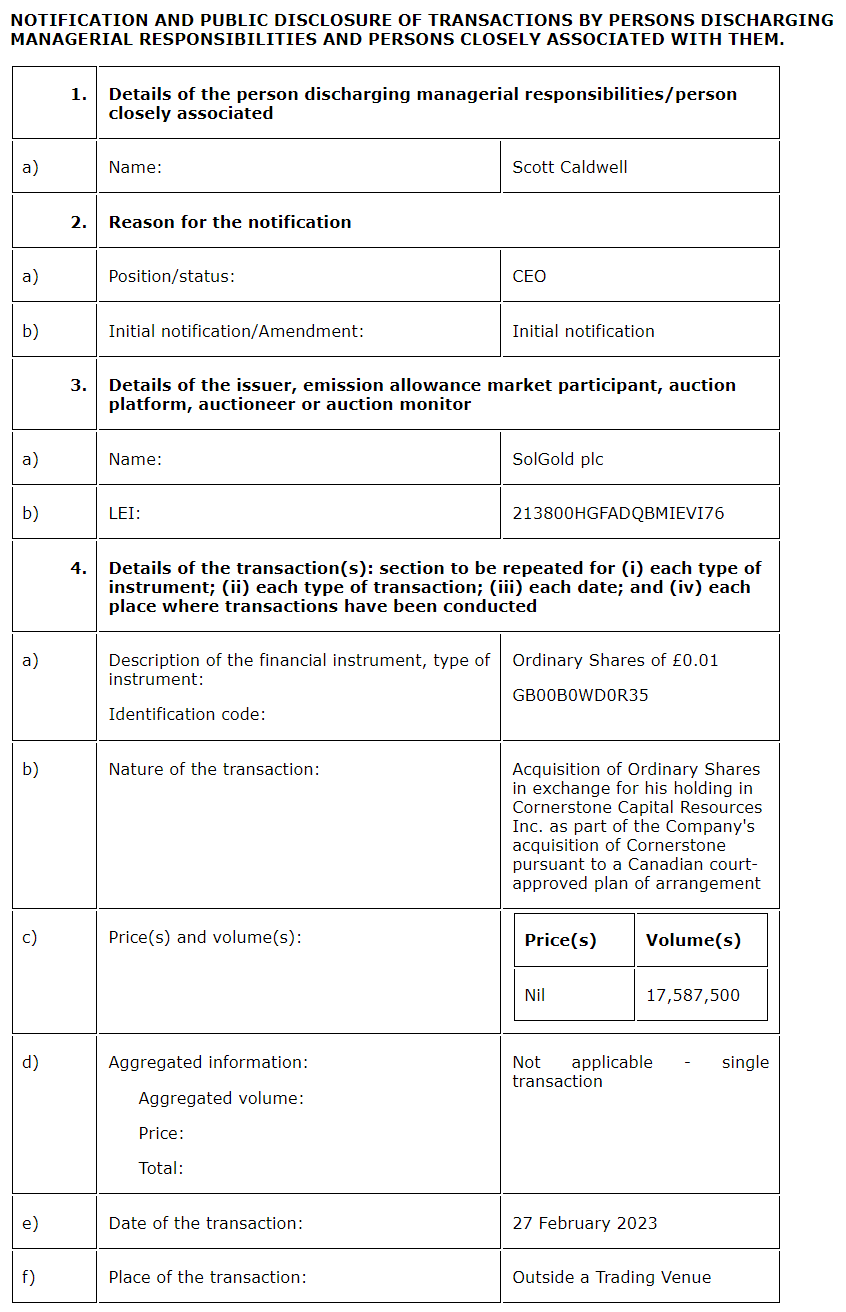 Further to the company's announcement of Nov. 10, 2022, and as described in the prospectus published by the company dated Feb. 22, 2023, Scott Caldwell, Solgold PLC's chief executive officer, acquired 17,587,500 ordinary shares of 0.01 pound sterling each in the company on Feb. 27, 2023.