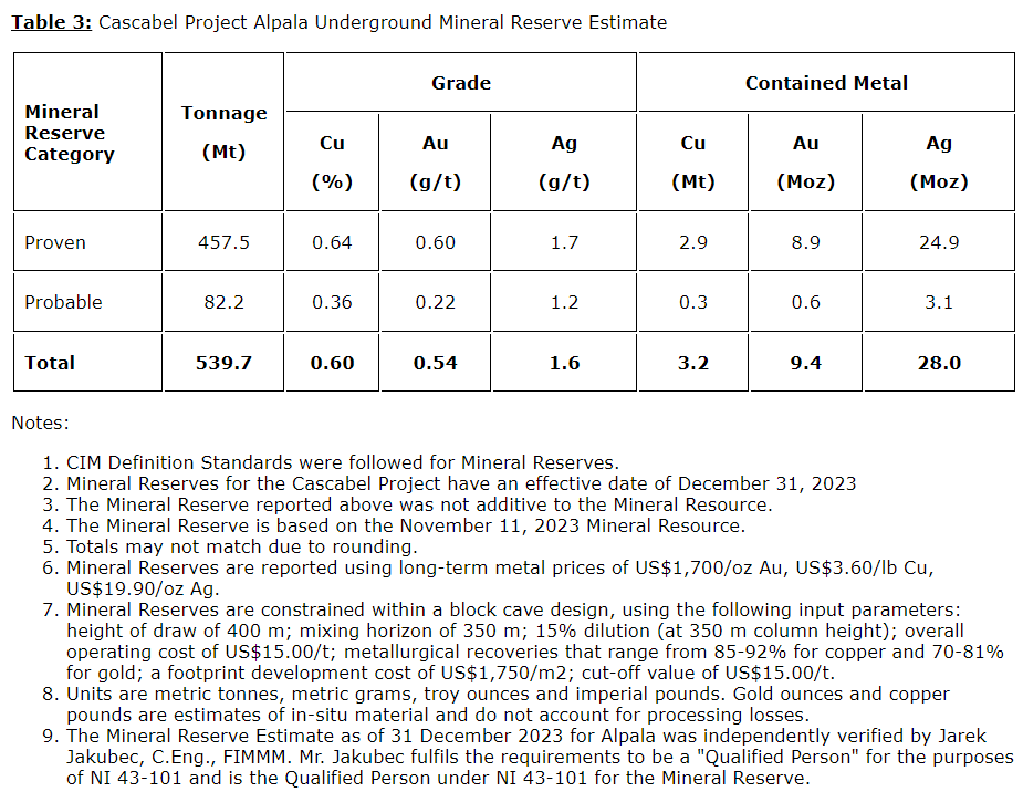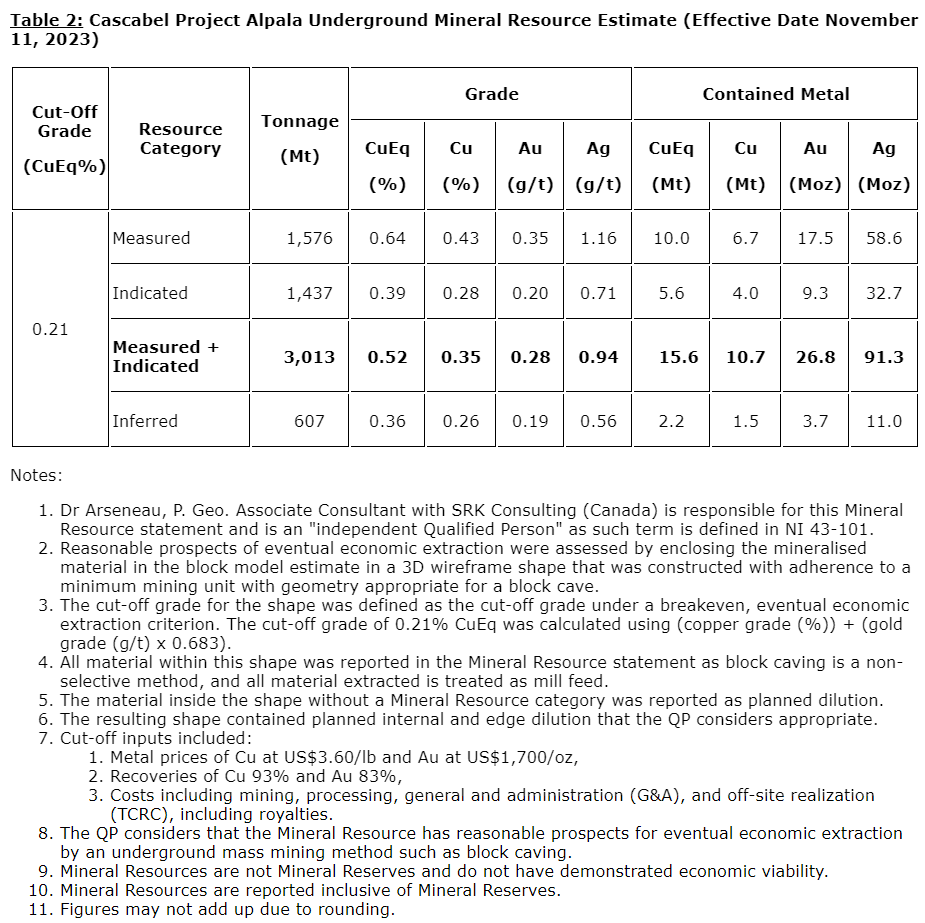 - The current Cascabel mine plan reflects the profitable exploitation of only 18 per cent of the Alpala measured and indicated mineral resource through a 28-year mine life -- the size of the entire resource indicates the mine's potential to be a multigenerational mining asset;