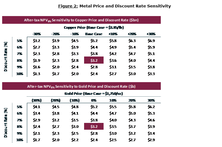 A sensitivity analysis was performed on the study's after-tax NPV (net present value) at an 8-per-cent discount to examine the sensitivity to commodity prices, capital costs and operating costs.