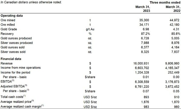 Revenue of $16.0 million, income from mine operations of $6.6 million and Net Income of $1.2 million all show significant improvements from the comparative quarter of 2022 (63%, 59% and 377% increases, respectively).