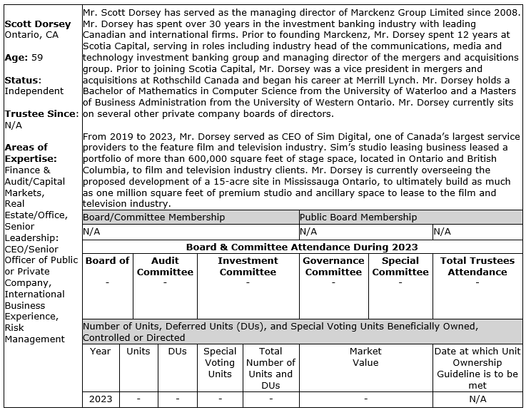Mr. Dorsey is independent within the meaning of applicable Canadian securities laws, and has advised the REIT that he does not currently beneficially own, control and/or direct any units of the REIT.
