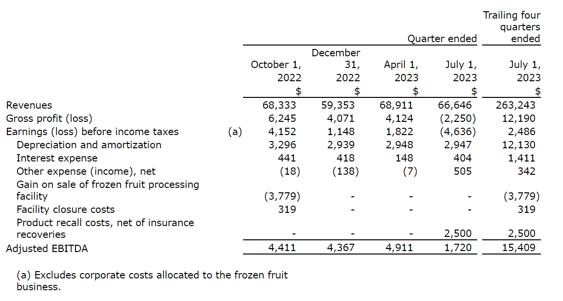 An attached table presents a summary of the reported results of operations of the frozen-fruit business for the periods presented, together with a reconciliation of adjusted EBITDA for the frozen-fruit business from earnings/loss before income taxes, which the company considers in this case to be the most directly comparable U.S. GAAP financial measure.