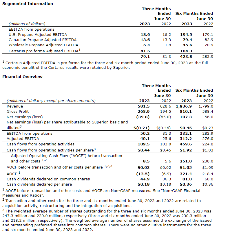 Superior's MD&A (management discussion and analysis), the unaudited consolidated financial statements and the notes to the unaudited consolidated financial statements as at and for the quarter ended June 30, 2023, provide a detailed explanation of Superior's operating results. These documents are available on-line on Superior's website at Superior Plus Financial Reports and on SEDAR under Superior's profile at SEDAR+.