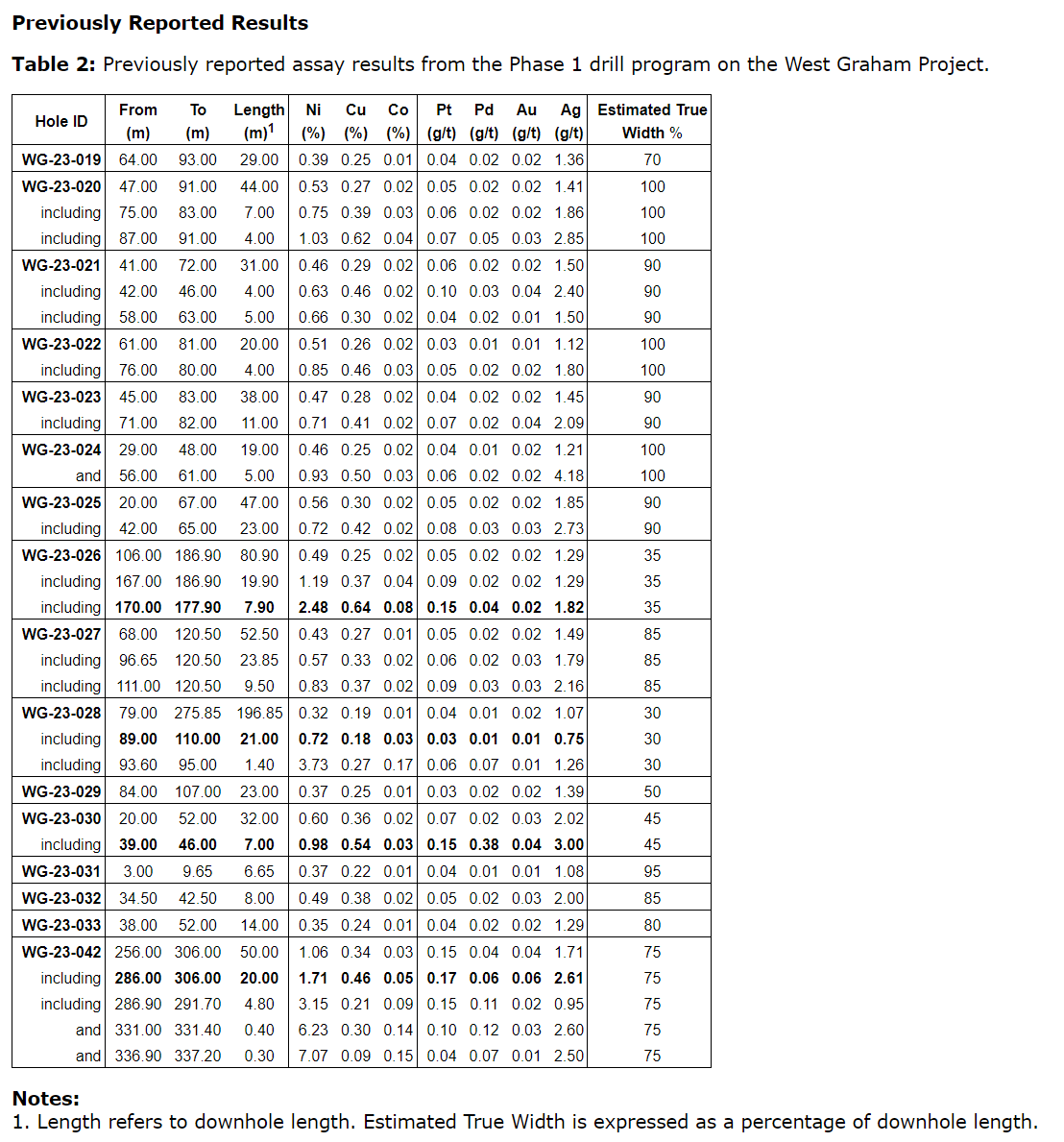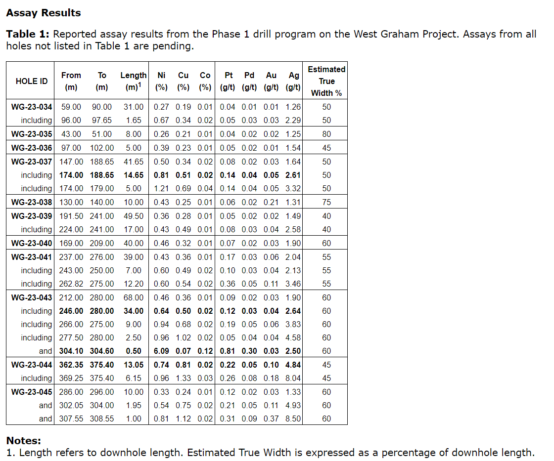 - The best intersections from the Phase 1 program include WG-23-26: 2.48% Ni, 0.64% Cu over 7.80 metres (see news release of April 11, 2023), and WG-23-42: 1.71% Ni, 0.46% Cu