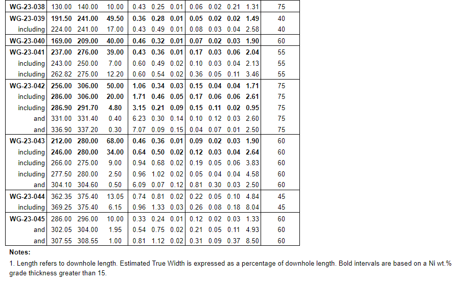 Hole WG-23-047 intersected a high-grade section that returned 1.27 per cent nickel and 0.47 per cent copper over 18 metres from 245 to 263 metres within a thick zone of nickel and copper mineralization grading 0.70 per cent Ni and 0.32 per cent Cu