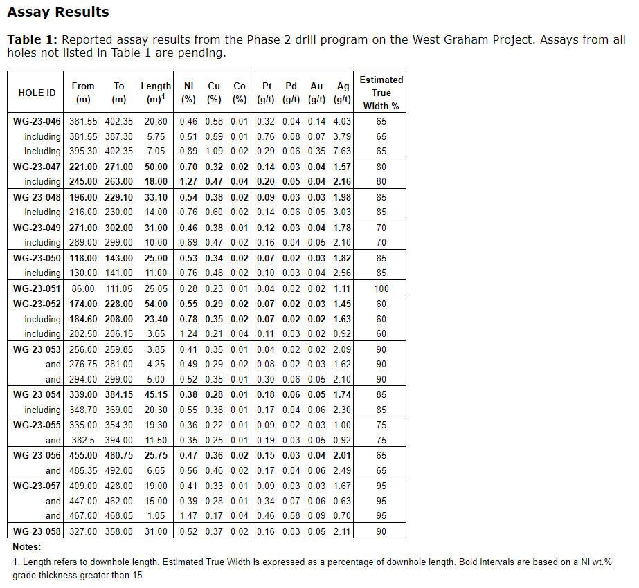 Grant Mourre, chief executive officer and president of SPC Nickel, commented: "We are very pleased with the excellent results we have so far received from our phase 2 drill program. The drill program successfully demonstrates the robust upside potential at West Graham, where we have not yet reached the limit of the strike and depth continuity of the main mineralized zone. While the recently completed ground EM survey has the potential to identify new targets within a sparsely tested footwall environment, we're looking forward to announcing additional drilling result and a maiden mineral resource estimate for the combined deposits in 2023."