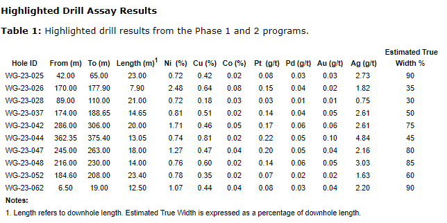 - WG-23-026: 7.90m @ 2.48% Ni and 0.64% Cu
