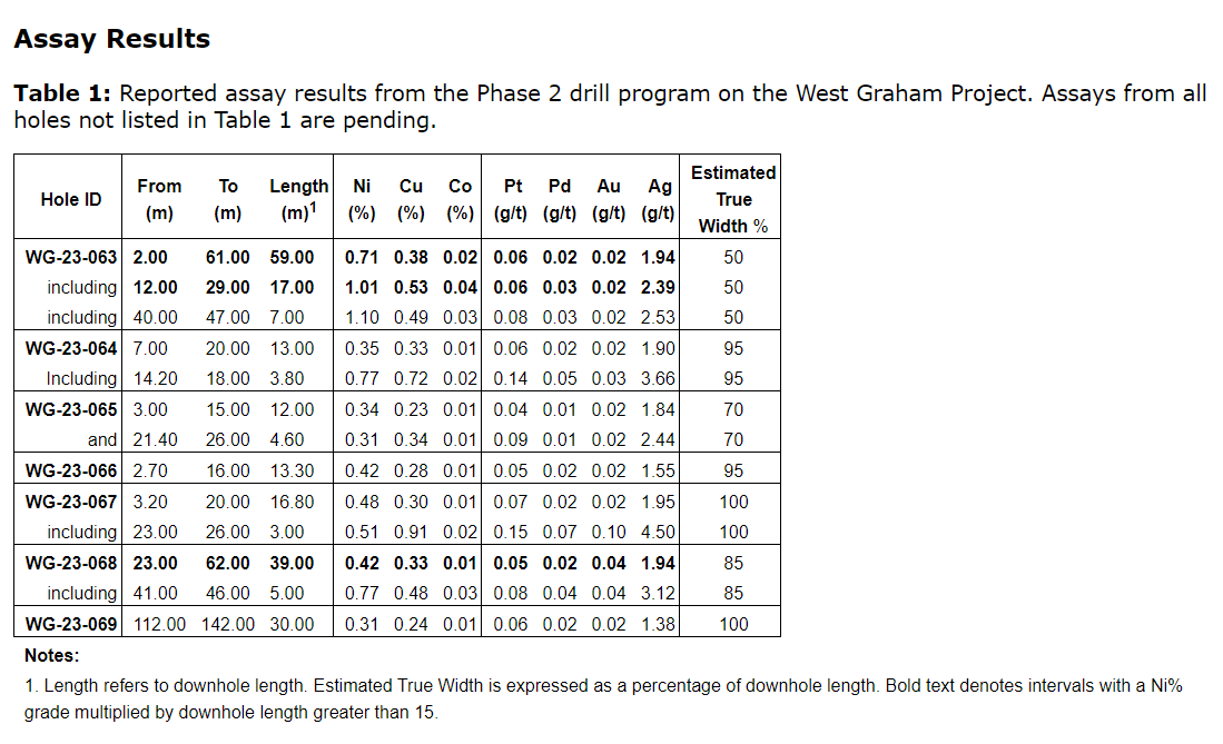 WG-23-063 -- 1.01 per cent nickel and 0.53 per cent copper over 17 metres (12 metres to 29 metres) within a wider zone grading 0.71 per cent Ni and 0.38 per cent Cu over 59 metres (two metres to 59 metres);