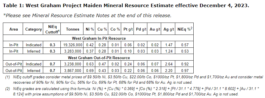 The mineral resources at West Graham were estimated by SGS Geological Services and are summarized in the table entitled "West Graham project maiden mineral resource estimate, effective Dec. 4, 2023." Sensitivity to cut-off grade is summarized in the table entitled "West Graham resources, sensitivity to cut-off grade," and contained metal is summarized in the table entitled "West Graham resources, contained metal in West Graham in-pit resources and out-of-pit resources." Mineral resources include near-surface mineralization with potential for open-pit mining, as well as higher-grade mineralization amenable to conventional underground mining methods. The full technical report, which is being prepared in accordance with National Instrument 43-101 -- Standards of Disclosure for Mineral Projects, will be available on SEDAR+ under the company's issuer profile within 45 days from this news release.