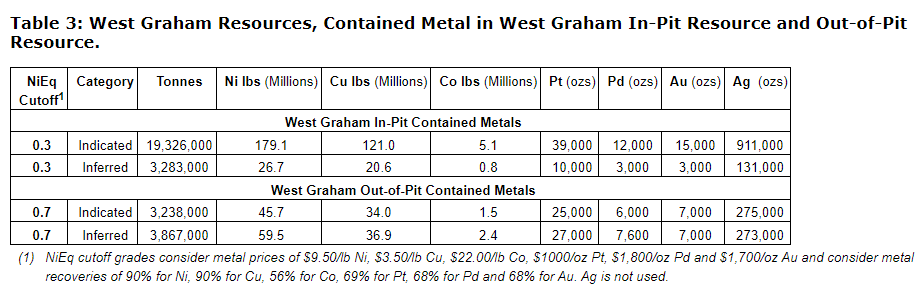 The MRE shows indicated resources of 224.8 million pounds (Mlb) of contained nickel and 155 million pounds of contained copper, and further inferred resources of 86.2 million pounds of contained nickel and 57.5 million pounds of contained copper (see the table entitled "West Graham resources, contained metal in West Graham in-pit resource and out-of-pit resource").