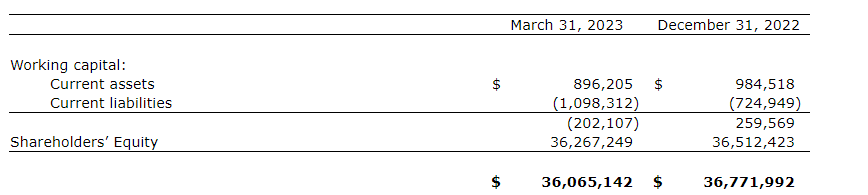 The corporation had a working capital deficit as at March 31, 2023, of $202,107 (Dec. 31, 2022 -- working capital of $259,569). The corporation's shareholders equity is $36,267,249 at March 31, 2023 (Dec. 31, 2022 -- $36,512,423).