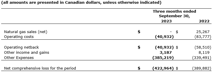 The corporation's loss and comprehensive loss for the three months ended Sept. 30, 2023, were $422,964 (2022: $389,882) resulting in an increased loss of $33,082 for the three months, partly due to the shut-in of production experienced during the three months ended Sept. 30, 2023.