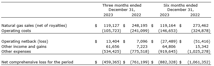 The corporation's gas production for the three and six months ended Dec. 31, 2023, averaged 668,000 and 334,000 cubic feet per day, respectively (three and six months ended Dec. 31, 2022: 1,084,000 and 593,000 cubic feet per day, respectively). The corporation's wells produced an average of 1,307,000 cubic feet per day (net to the corporation) for the 47 days that they were on production during November, and December 2023.