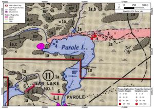 The North Nipigon Block A prospecting program continues to develop a lithium target on the northern edge of Parole Lake where confirmation sampling of a spodumene rich boulder returned 0.866% Li2O and 0.413% Li2O from sample 475550 and 475551, respectively (Table 1). This boulder historically returned assay values of 0.764% Li2O and 0.685% Li2O during a 2018 sampling program (Ontario Geological Survey AFRI 20000019444). A second boulder was discovered on the shore of Parole Lake, approximately 100 m to the west, and returned 0.538% Li2O (Table 1). A detailed mapping and sampling program is planned for the north shore of Parole Lake to determine the provenance of the lithium bearing pegmatite boulders (Figure 3).
