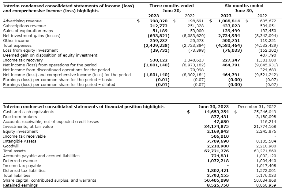 - Net income and comprehensive income of $464,791 (basic earnings per share of nil) as compared with net loss and comprehensive loss of $9,521,242 (basic loss per share of seven cents) for the six months ended June 30, 2022.