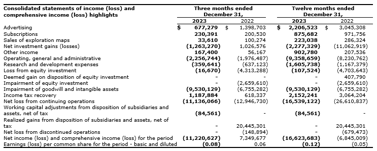 - Sales of exploration maps of $223,038 as compared with $286,324 for the year ended Dec. 31, 2022;