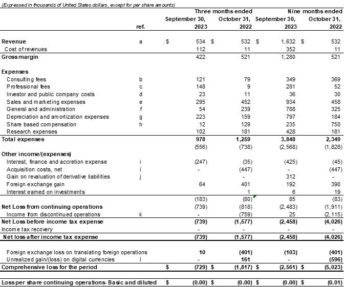 Net Loss after income tax expenses decreased by 53.1% to $739,000 for Q3 2023 compared to $1,577,000 in Q3 2022. Net Loss after income tax expenses decreased by 38.9% to $2,458,000 for nine months ended September 30, 2023, compared to $4,026,000 in the nine months ended October 31, 2022.