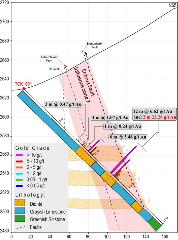 Figure 1. Cross section of drillhole TCK_001 showing drillhole geology and gold assays.