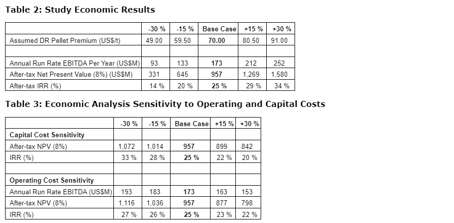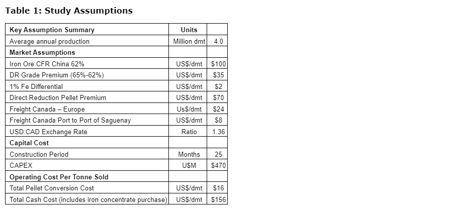 - Ability to generate $173-million (U.S.) of annual EBITDA (earnings before interest, taxes, depreciation and amortization) assuming a $70 (U.S.)/tonne DR grade pellet premium.