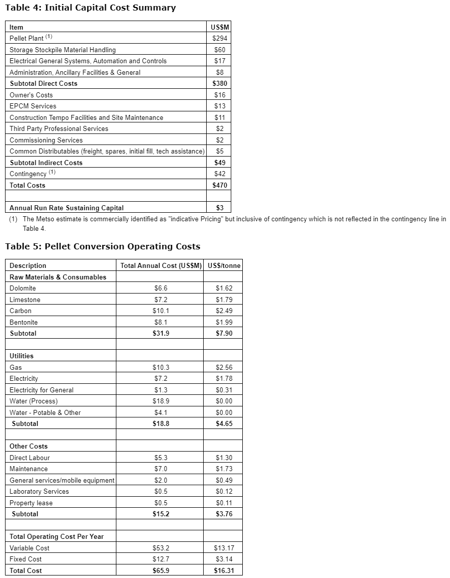 The pelletizer scope and costs are based on an indicative order of magnitude estimate provided by Metso for the design, supply, delivery and installation of a four million tpa pellet plant. The initial capital cost is minus-30 per cent/plus-50 per cent AACE International Class 5. The Metso proposal represents 57 per cent of the total project capital requirement. BBA has performed an independent assessment of the pelletizer costs based on internal data and adjusted the Metso proposal to allow for winterization, civil works and growth. The contingency associated with initial capital costs has been set at $42-million and is made up of 20 pre cent on direct and indirect costs, excluding the pellet plant, plus 5 per cent on the pellet plant cost.