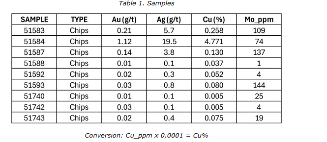 A total of nine rock chip samples were collected from mineralized outcrops. Three samples (51584, 51583 and 51587) returned encouraging results (Table 1). The best result came from sample 51584 which returned 4.77 per cent Cu (copper), 1.12 g/t (grams per tonne) Au (gold), 19.5 g/t Ag (silver), 74 ppm (parts per million) Mo (molybdenum). The samples were taken from outcropping granodiorite and hydrothermal breccias hosting Cu-porphyry-style mineralization: hydrothermal breccias with pyrite-chalcopyrite matrix, quartz-sulphide stockwork veining and traces of bornite.