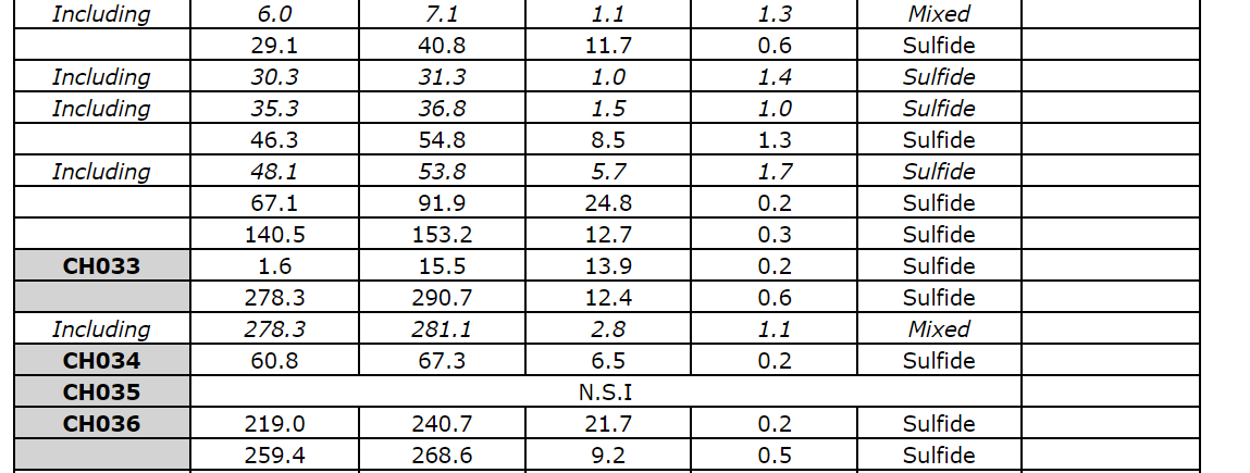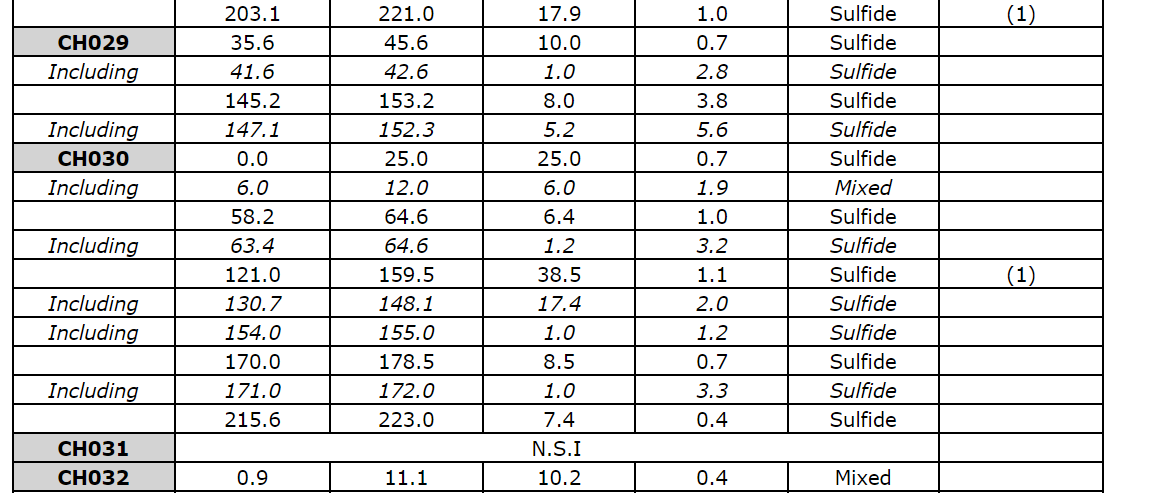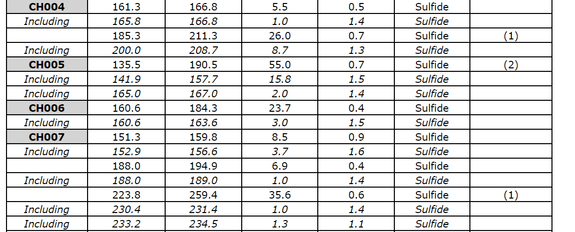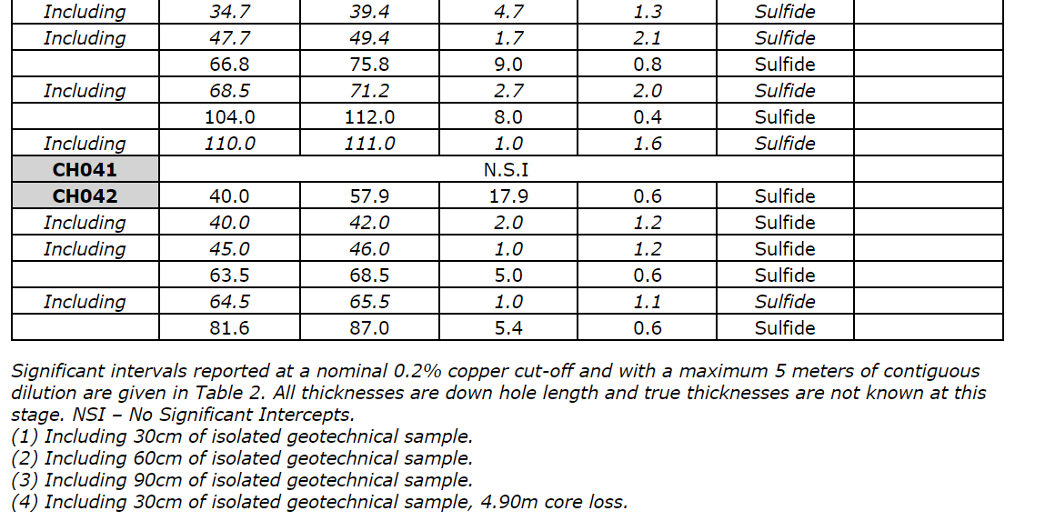 CH002 -- 1.1 per cent copper over 37.0 metres from surface;