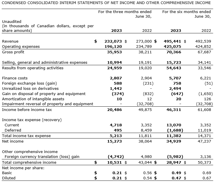STEP ENERGY SERVICES LTD. REPORTS SECOND QUARTER 2023 RESULTS