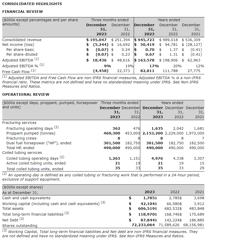 Step Energy Services Ltd. has released its financial and operating results for the three months and twelve months ended Dec. 31, 2023. The following press release should be read in conjunction with the management's discussion and analysis (MD&A) and audited consolidated financial statements and notes thereto as at Dec. 31, 2023.