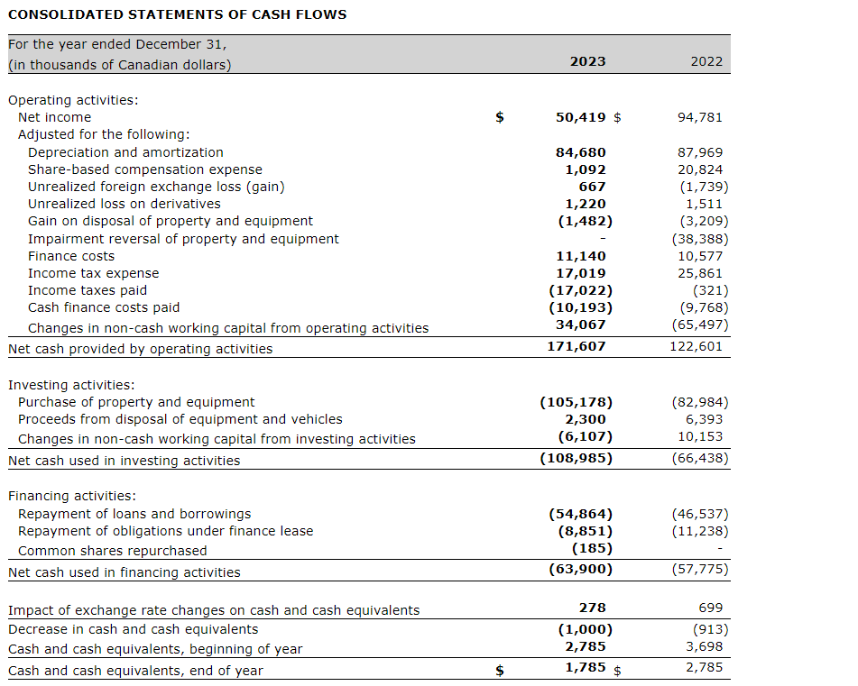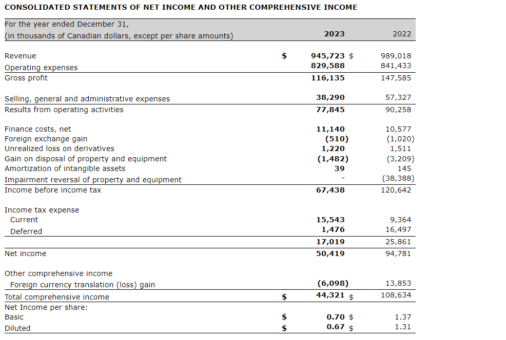 Net income for the year ended Dec. 31, 2023, of $50.4-million, or 67 cents per diluted share, compared with $94.8-million in 2022, or $1.31 per diluted share. Two thousand twenty-two net income was positively impacted by the reversal of $38.4-million of impairment loss taken in 2020, following the significant improvement in business conditions.