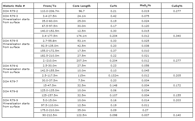 The copper equivalent calculation utilizes the standard equation and is based on current spot metal prices of copper at US$3.40 per pound, Re at $4,400 per ounce, and molybdenum at $20.60 per pound. Recoveries are set at 100% for all metals for purposes of the copper equivalent calculation as no metallurgical test data is available. Cu Eq is used for illustrative purposes only and does not imply that the metals are economically recoverable.