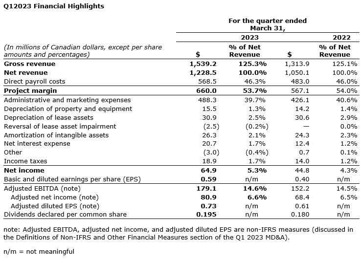 (1) Adjusted diluted EPS, adjusted net income, adjusted EBITDA and adjusted EBITDA margin are non-international financial reporting standard measures, and organic growth and acquisition growth are other financial measures (discussed in the definitions section of the Q1 2023 management's discussion and analysis).