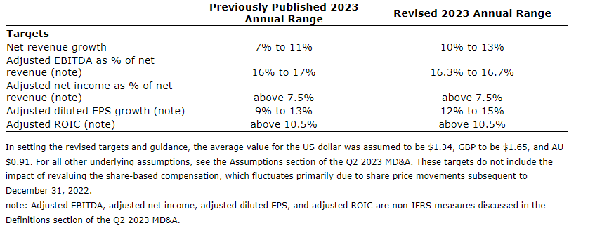 In setting the revised targets and guidance, the average value for the United States dollar was assumed to be $1.34, pound sterling to be $1.65 and Australian dollar 91 cents. For all other underlying assumptions, see the assumptions section of the Q2 2023 MD&A (management discussion and analysis). These targets do not include the impact of revaluing the share-based compensation, which fluctuates primarily due to share price movements subsequent to Dec. 31, 2022.