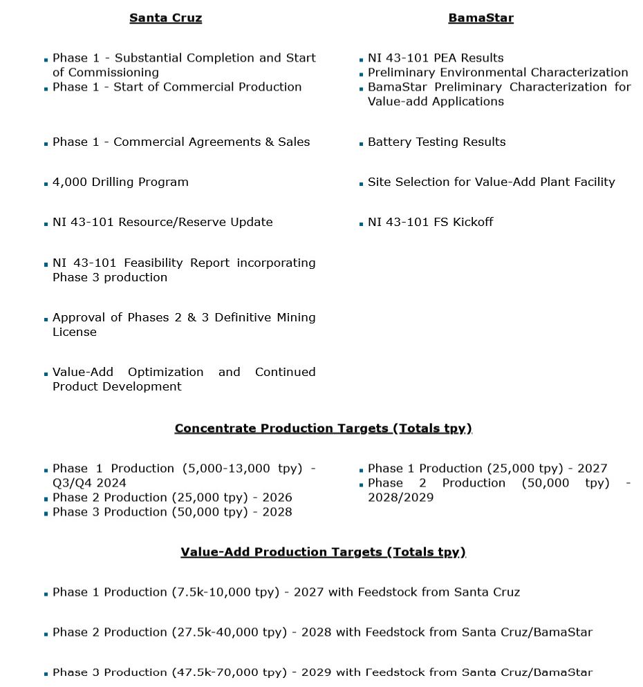 Given this bullish outlook, it is an exciting time to deliver on our commitment and bring Santa Cruz online to deliver very high-quality material in a proven producing district. The team is working towards bringing BamaStar online a few years behind Santa Cruz, with the first production planned for 2027. We expect to be one of the first movers in new production and to be in the first quartile of costs. Santa Cruz is projected to generate operating profits during Phase 1 and grow more profitable as Phases 2 and 3 scale.