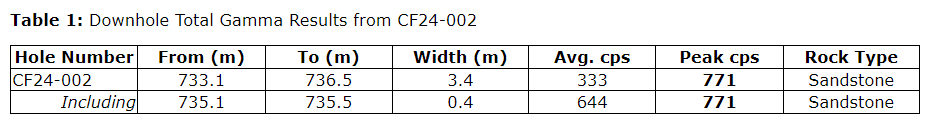 Hole CF24-002 encountered anomalous radioactivity near the unconformity in the Athabasca sandstone of 333 counts per second (cps) over 3.4 metres, including 0.4 m at 664 cps with a peak of 771 cps;