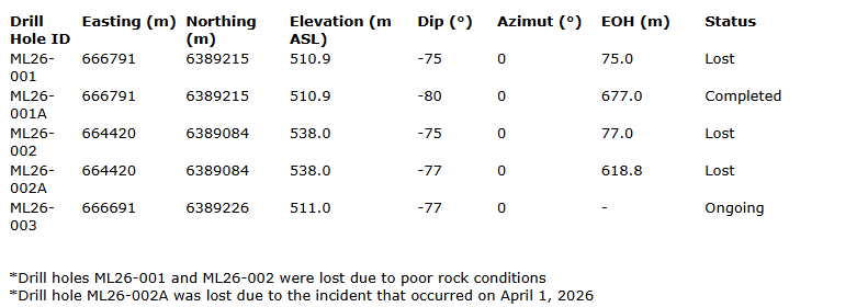 The first completed drill hole (ML26-001A) successfully intersected multiple fault zones in both the sandstone and basement rocks. This included two wide fault zones (approximately 66 to 109 metres) in the sandstone exhibiting strong quartz dissolution, brecciation and broken core. In the basement, a significant graphitic fault zone was encountered, associated with strong to locally massive clay alteration. This zone is interpreted to represent the primary conductive source identified in the company's geophysical data sets.