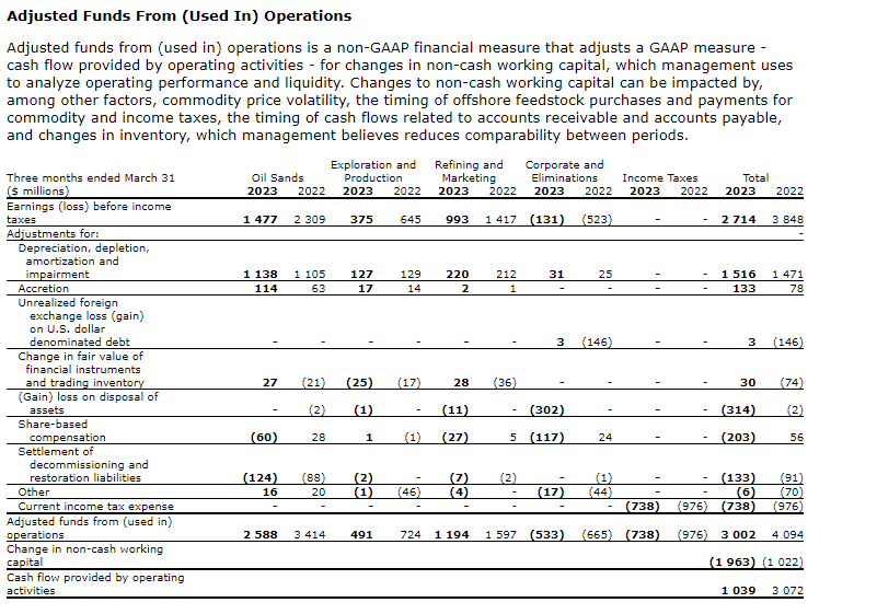 Cash flow provided by operating activities, which includes changes in non-cash working capital, was $1,039-million (78 cents per common share) in the first quarter of 2023, compared with $3,072-million ($2.14 per common share) in the prior-year quarter. In addition to the factors impacting adjusted funds from operations, cash flow provided by operating activities was impacted by a larger use of cash associated with the company's working capital balances in the first quarter of 2023 compared with the prior-year quarter. The use of cash in the first quarter of 2023 was primarily due to income tax payments made relating to the company's 2022 income tax expense, and the timing of commodity tax and royalty payments.