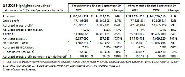 "We are pleased to have delivered solid operational and financial performance in the third quarter, supported by our increased sugar refining capabilities in Canada and the U.S.," said Jonathan Taylor, founder and chief executive officer of Sucro. "Positive market dynamics and growth of our internal refining capacity allowed us to increase our sugar deliveries and capture strong margins on each tonne we delivered, and this led to adjusted gross profit and adjusted EBITDA levels well above our Q3 2022 performance. Also, despite the growth of our platform and ongoing inflationary pressures, we showed our ability to tightly manage costs, with our SG&A expenses declining as a percentage of sales. Looking forward, our Canada and the U.S. sugar refinery expansion initiatives remain on track, and our team remains highly motivated to execute our growth plans."