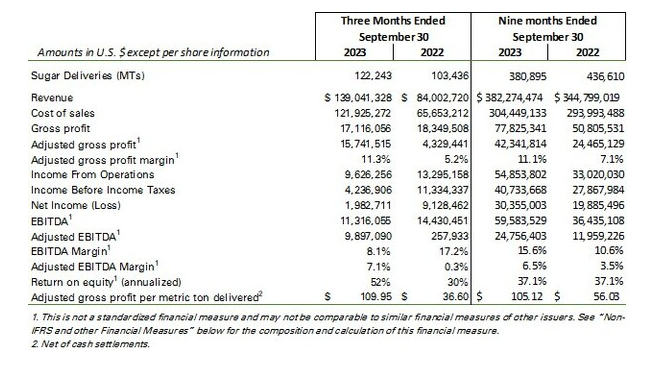 Sucro Ltd. has released the financial results for the three and nine months ended Sept. 30, 2023, of its wholly owned subsidiary, Sucro Holdings LLC. Sucro acquired Sucro Holdings pursuant to a corporate reorganization effective Oct. 2, 2023, and did not conduct any operations prior to that time. All amounts are shown in U.S. dollars unless otherwise noted.