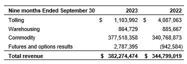 During the three months ended Sept. 30, 2023, Sucro Holdings' futures and options gains were $6.3-million, compared with a $1.0-million loss for the corresponding 2022 period, a $7.3-million increase relating to gains on its sugar No. 11 futures contract positions. For the same periods, tolling revenues declined by $1.1-million (86.0 per cent), primarily as a result of the shutdown of the Atlanta facility in February, 2023, which was mostly used to provide services to a third party, while warehousing revenues remained relatively flat.