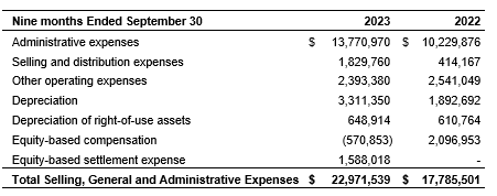 The composition of Sucro Holdings' selling, general and administrative expenses for the nine-month periods ended Sept. 30, 2023, and Sept. 30, 2022, is detailed in an attached table.