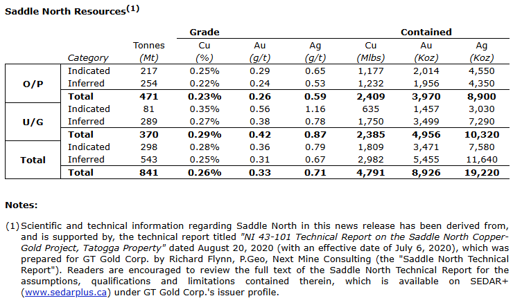 Mineral resource: the Saddle North technical report (as defined herein) reported indicated resources containing approximately 3.47 million ounces gold and 1.81 billion pounds copper and inferred resources containing approximately 5.46 million ounces gold and 2.98 billion pounds copper.