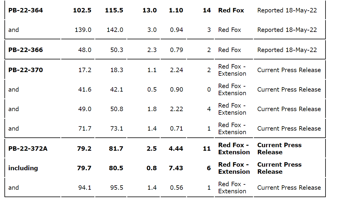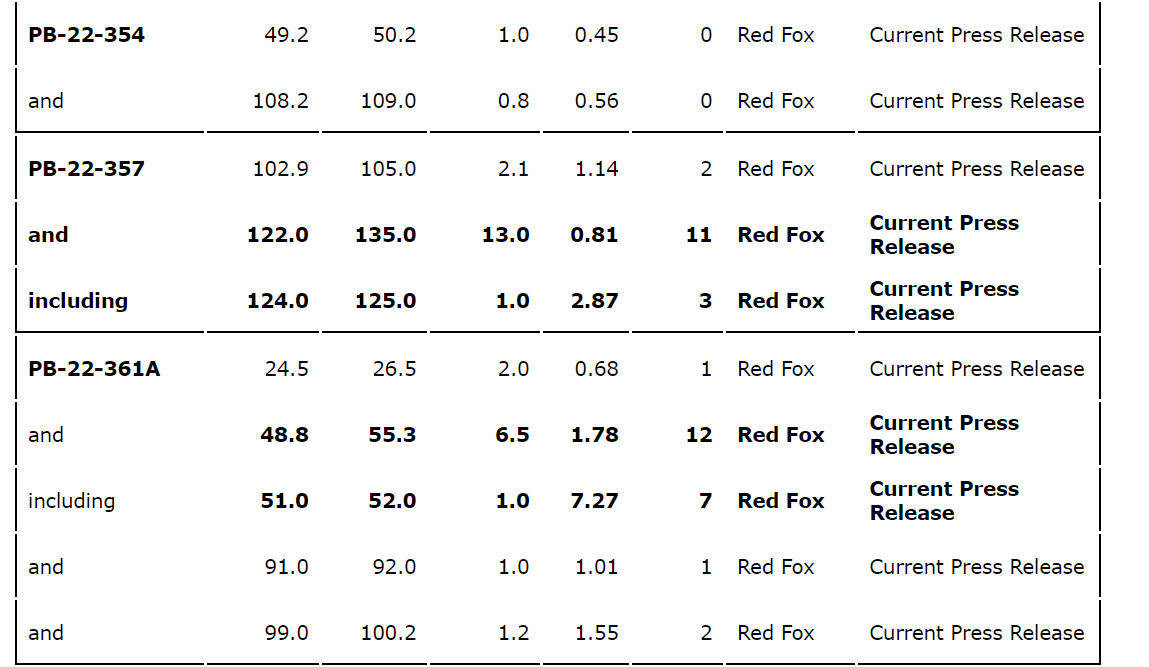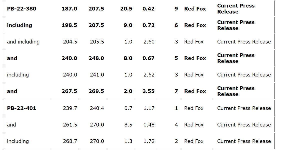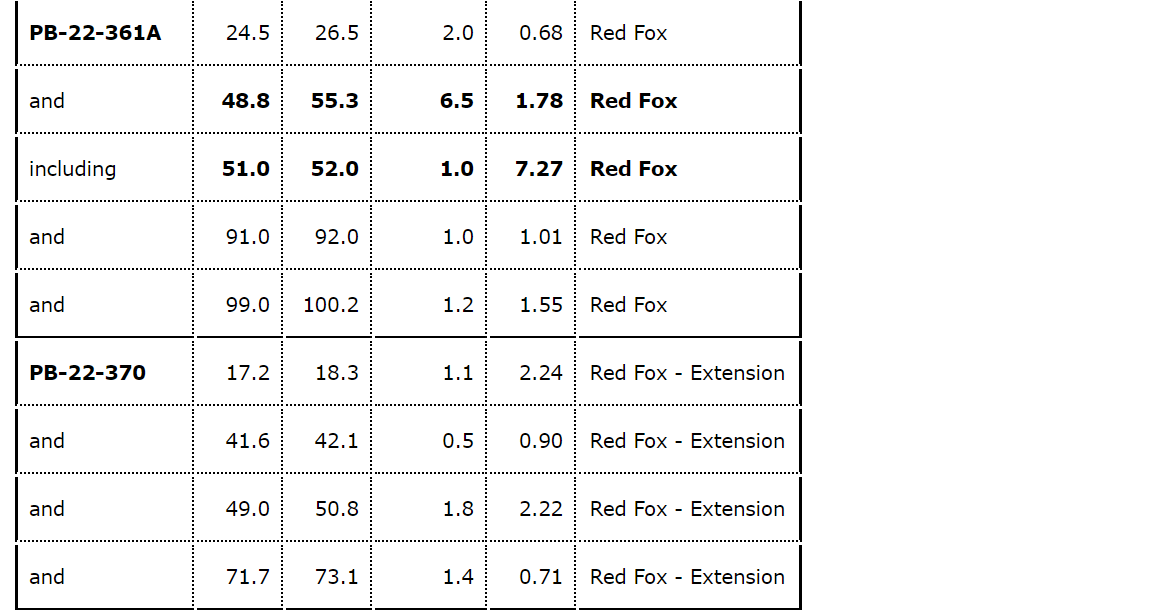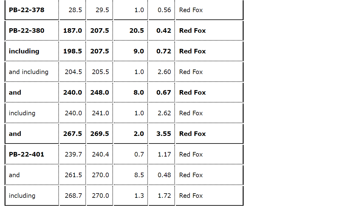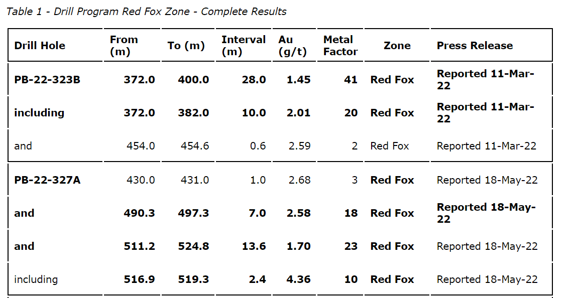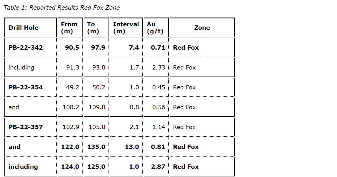 - DDH PB-22-372A returned 4.44 g/t Au over 2.5 metres from 79.2 metres to 81.7 metres, extension of the Red Fox zone to the northwest.