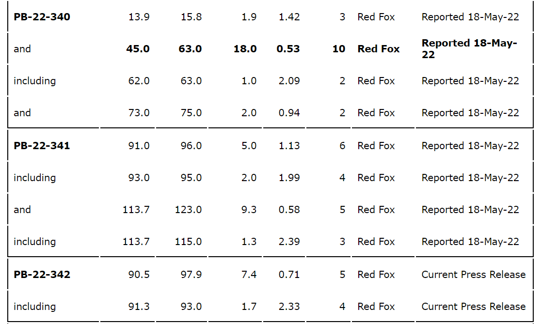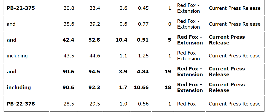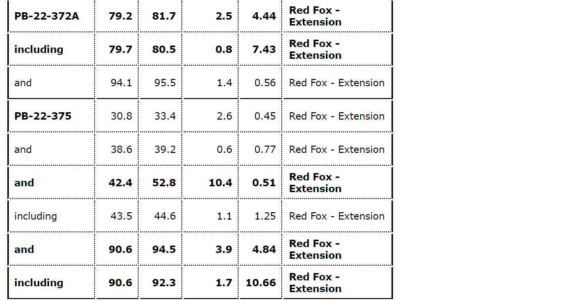- DDH PB-22-375 returned 4.84 g/t Au over 3.9 metres from 90.6 metres to 94.5 metres from the western limit of the Red Fox zone.